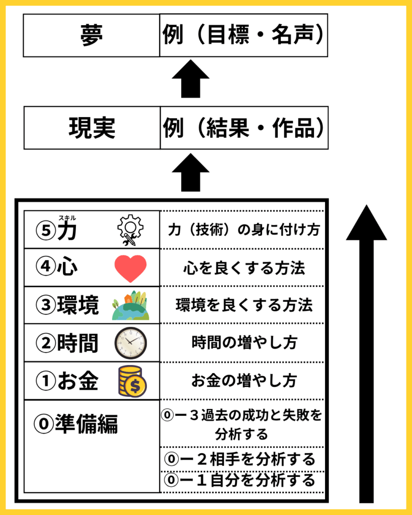 「お金」「時間」「環境」「心」「力(スキル)」の順に整えていく形です。