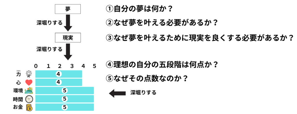 4️⃣ 理想の自分を5段階で評価すると何点か?(お金・時間・環境・心・力)