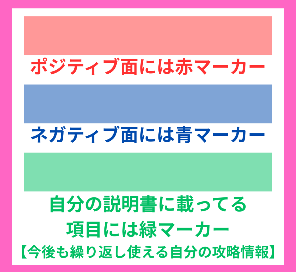 赤=ポジティブ面、青=ネガティブ面、緑=説明書に載せる項目です。