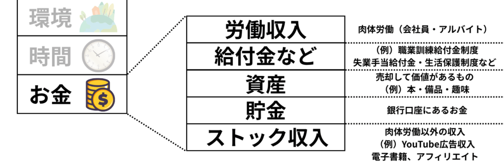 「お金」「時間」「環境」「心」「力(スキル)」と言われても抽象的で分かりづらいと思うので、これからそれぞれの項目について詳しく説明します。