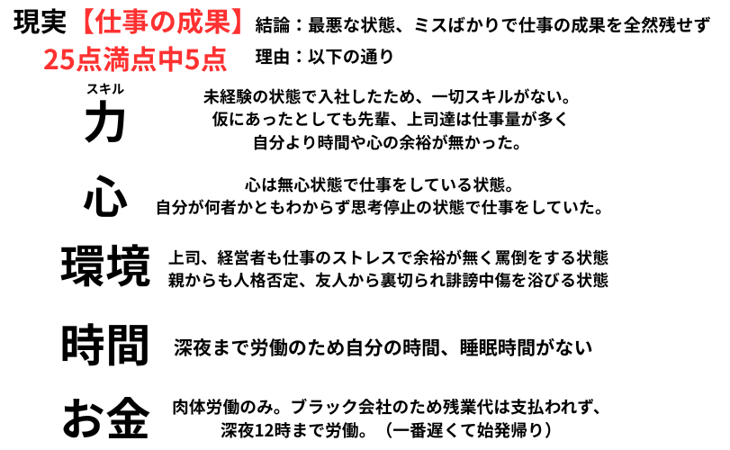 満足度は25点中5点で、最低の状態でした。なぜ仕事の成果を全く出せなかったのかを説明します。
