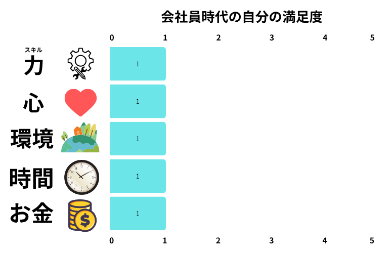 「環境」は「お金」や「時間」と違い数値化できないため、1点から5点の範囲で自分がどれほど満足しているか考えてみてください。