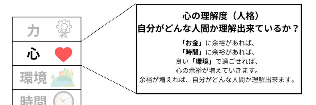 これも「環境」と同様数値化できないので、「どれくらい自分を理解しているか?」の感覚で点数を付けてもらって大丈夫です。
