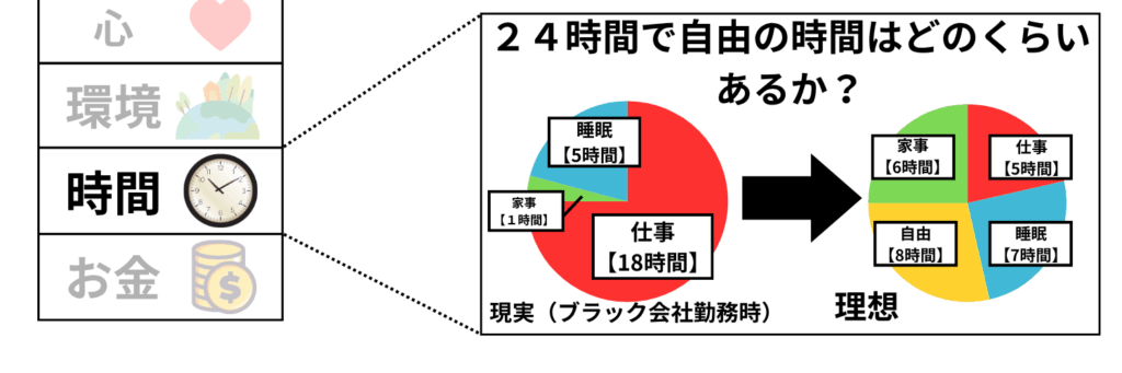 1日24時間の中でどれだけ自分の自由時間があるか?これが時間の満足度になります。