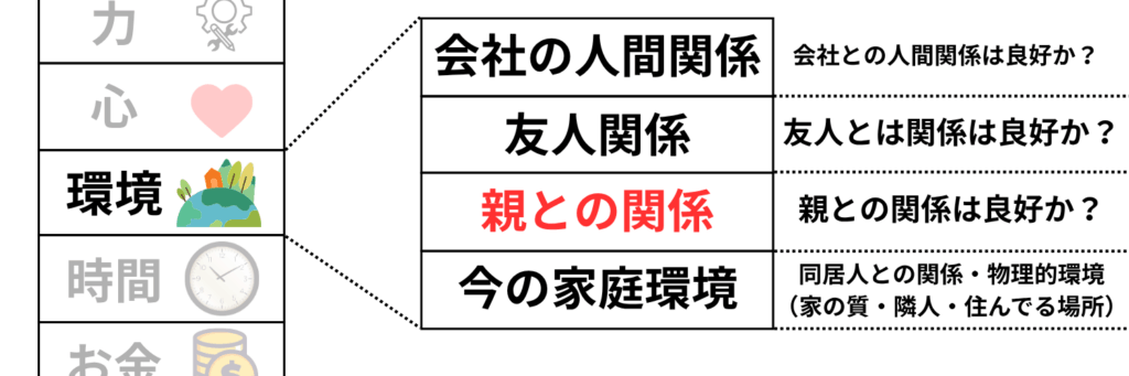 特に「お金」や「環境」(後に説明する物理的環境を含む)の満足度は、人によって異なります。