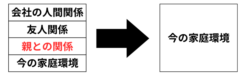 会社員を辞めることで人間関係に悩まなくなり、誹謗中傷してくる友人、親と絶縁することによって、今の家庭環境(物理的)の悩みしかない状態にさせました。