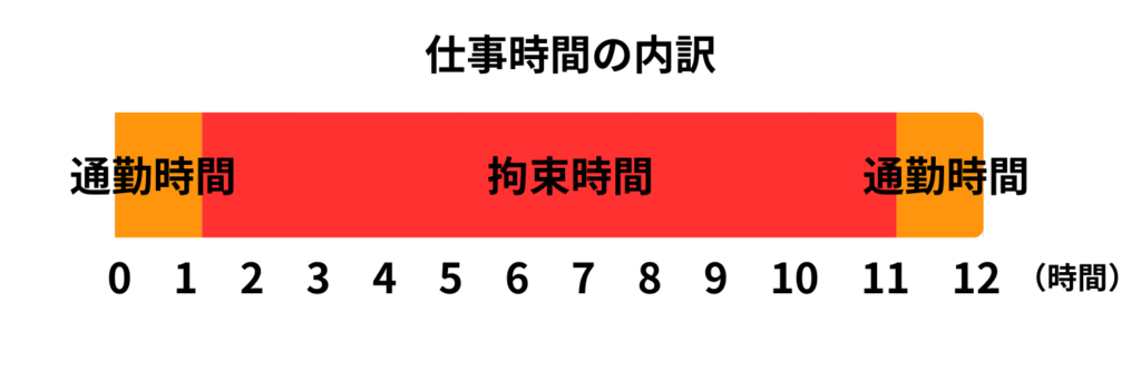 過去の自分の内訳ですが通勤時間2時間、拘束時間10時間の合計12時間です。(もっと酷い時もありました)